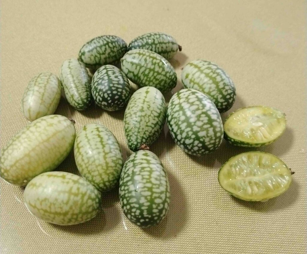 長野県の道の駅で見たことのない野菜を発見しました。メキシコ原産の野菜で2㎝位のキュウリです。皮は少し固いのですが中は種があり、味はキュウリです。サラダに入れて食べました。「カラスウリ」の赤くなる前や「スズメウリ」によく似ています。好奇心いっぱい、食べたことのないものは一度食べてみたい!