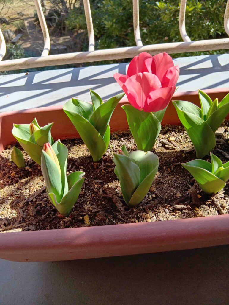 外の花壇のチューリップ🌷はまだ花めが出ていませんが ベランダのチューリップ🌷は花が咲きました。「あれ〜、小さい!」もっと茎が伸びてからピンクのチューリップが咲く予定でした。でも、今年一番早く咲いたお花です。